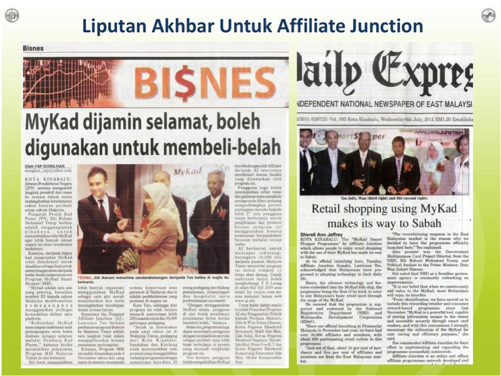 Orang ramai kini boleh menggunakan kemudahan terbaru menerusi mykad apabila sebuah syarikat tempatan iaitu affiliate junction memperkenalkan program mykad smart shopper mss yang memberikan rebat tunai dan pelbagai faedah lain kepada pengguna apabila membeli belah di premis perniagaan terpilih.