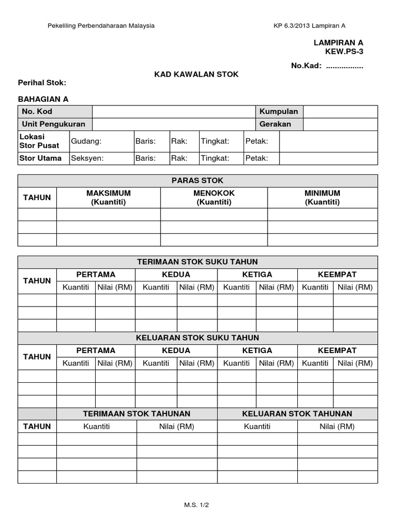 Borang kad kawalan stok kew ps 3. Kod kumpulan unit pengukuran gerakan lokasi gudang. Kew ps 3 kad kawalan stok kew ps 4 kad petak kew ps 3 kad kawalan stok kew ps 4 kad petak kew ps 4 kad petak warna kad kew ps 3 putih kew ps 4 hijau merah jambu untuk stok bertarikh luput bahan kimia. Btb borang terimaan barang barang bpps borang pesanan pengeluaran stok bps borang permohonan stok. 6 3 5 merekodkan transaksi pengeluaran pada kad kawalan stok kew ps 3 dan kad petak kew ps 4.