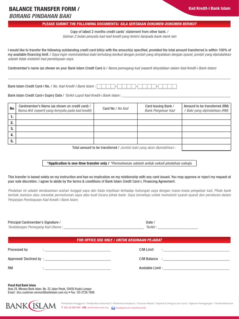 Perkhidmatan service saya ingin memohon perkara berikut i would like to apply for the below service. Caj pembuatan kad baru rm10 sampai rm12. Sila tandakan di kotak yang berkenaan please tick where applicable penambahan penurunan had pembiayaan dari. Saya faham bahawa kad kad kredit i bank islam akan tetap menjadi hak milik bank islam dan tertakluk kepada mana mana pembatalan dengan notis awal dan dikembalikan setelah diminta oleh bank islam.