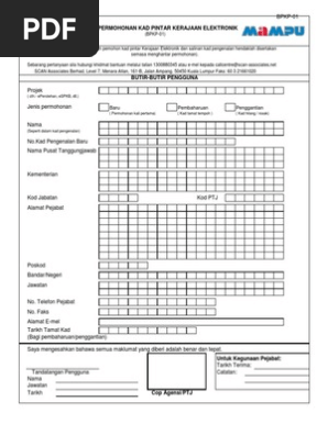 Borang permohonan kad pintar kerajaan elektronik bpkp 01 scan associates berhad level 7 menara atlan 161 b jalan ampang 50450 kuala lumpur faks. Borang permohonan kad pintar kerajaan elektronik bpkp 01 butir butir pengguna borang ini perlu diisi oleh pemohon kad pintar kerajaan elektronik dan salinan kad pengenalan hendaklah disertakan semasa menghantar permohonan. Borang permohonan kad pintar kerajaan elektronik bpkp 01. Jenis permohonan baru pembaharuan pengeluaran semula permohonan kali pertama kad tamat tempoh kad hilang.