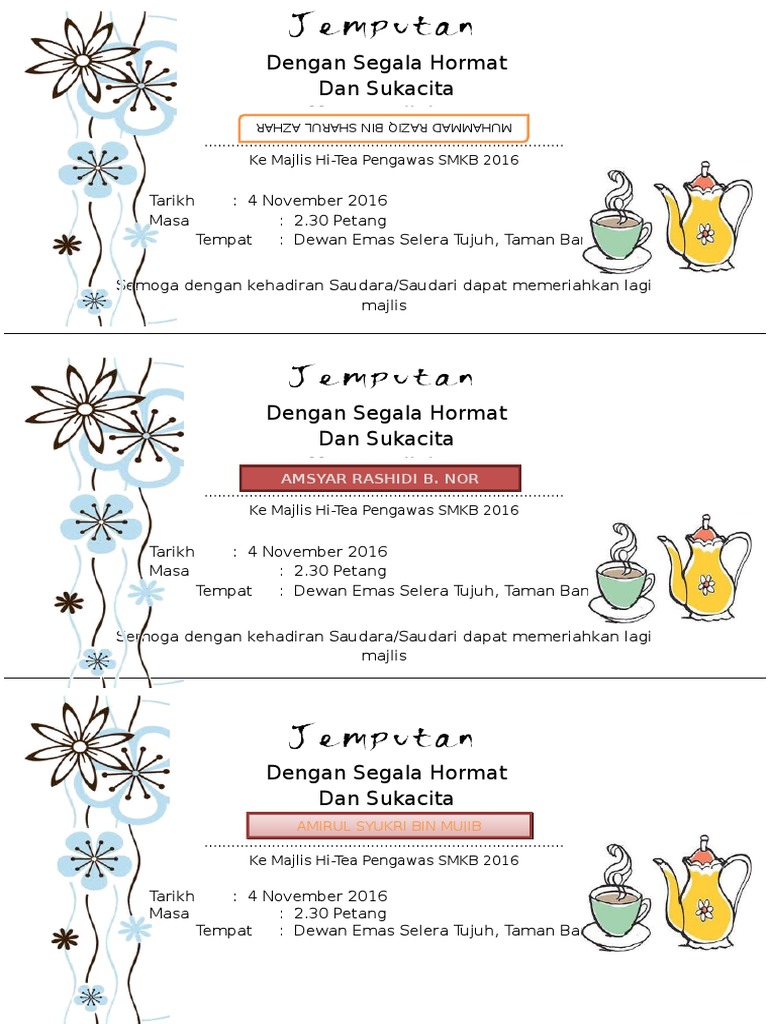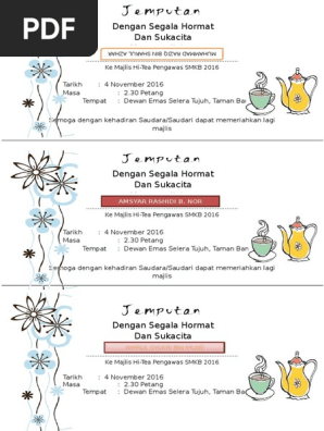 Contoh kad jemputan ke majlis hi tea. Jika ada yang sedang mencari contoh atau idea mahu siapkan kad jemputan mana mana majlis mungkin boleh buat seringkas ini. Dengan temanya hitam dan putih saya cuma letakkan kerawang sebagai hiasan bingkai dan juga latar belakang yang menjadi bayang belakang. Contoh surat jemputan majlis persaraan guru besar have an image associated with the other contoh surat jemputan majlis persaraan guru besar it also will include a picture of a kind that might be observed in the gallery of contoh surat jemputan majlis persaraan guru besar. Yang berusaha tuan haji mohamad kamaludin bin taib pengetua smk kampong jawa serta barisan pentadbir bersama dif jemputan ke dewan.