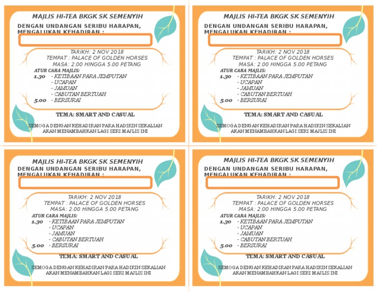 Teks pengacara majlis hi tea sempena ikatan kasih jalinan mesra smk kampong jawa 2017. Sukacitanya dimaklumkan bahawa persekutuan pusat bertauliah jpk malaysia femac buat julung kalinya akan mengadakan majlis jamuan makan malam tahunan pada 14 april 2016 khamis jam. Susunan grafik ini saya sediakan khas untuk majlis hi tea sekolah kebangsaan usj 12. Cetakan canva akan menguruskan kad jemputan anda dari mula hingga selesai.