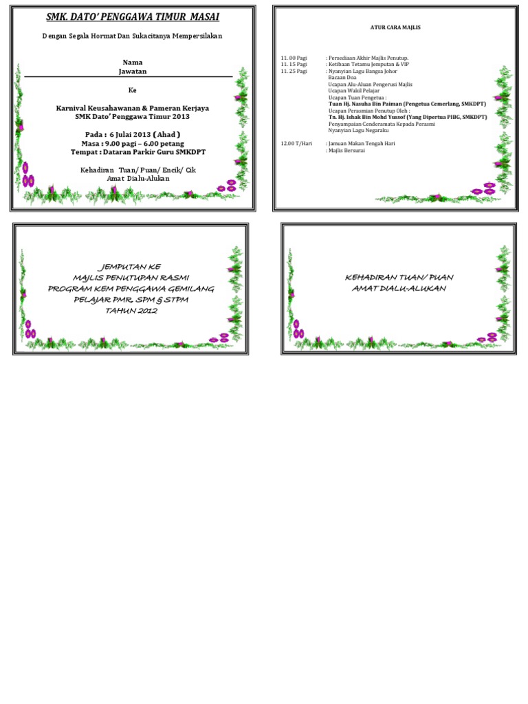 Contoh surat rasmi jemputan ke majlis sukan contoh 0108 via contoh0108 surat jemputan ke majlis anugerah cemerlang via slideshare surat rasmi sukan via slideshare contoh kad jemputan raya joy studio design gallery via joystudiodesign contoh surat rasmi via slideshare. Ia melambangkan personaliti majlis yang bakal berlangsung. Kad jemputan perkahwinan misalnya merupakan utusan pertama yang akan bersama tetamu jemputan. Jemputan rasmi http wayanadnoticeboard com admini kad jemputan rasmi contoh 1 kad jemputan negeri terengganu darul iman 1 tempat dibawah.
