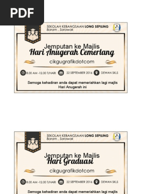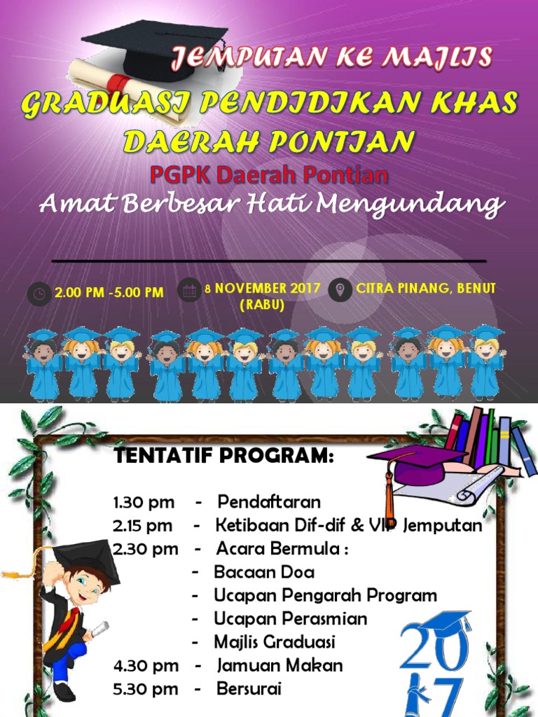 Contoh kad jemputan majlis konvokesyen. Kad jemputan setiap graduan akan menerima satu 1 kad jemputan untuk dua 2 orang sahaja tidak termasuk graduan. Reka dan kongsikan kad jemputan tersuai untuk majlis konvokesyen anda. Sebarang pertanyaan sila hubungi. Para tetamu yang tidak membawa kad jemputan tidak dibenarkan masuk ke dalam dewan.