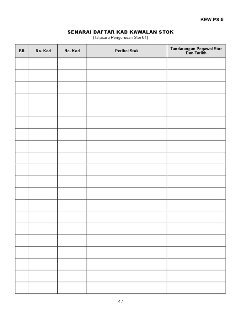 Kp 6 3 2013 lampiran c lampiran c kew ps 5 pekeliling perbendaharaan malaysia senarai daftar kad kawalan stok bil. Angka asal hendaklah digaris dengan satu garisan angka betul ditulis dibahagian atas angka asal pembetulan ditandatangani ringkas oleh. Bagi kad daftar stok untuk stok yang mempunyai tarikh. Stor pusat utama perlu mencapai sekurang kurangnya 4 kadar pusingan.