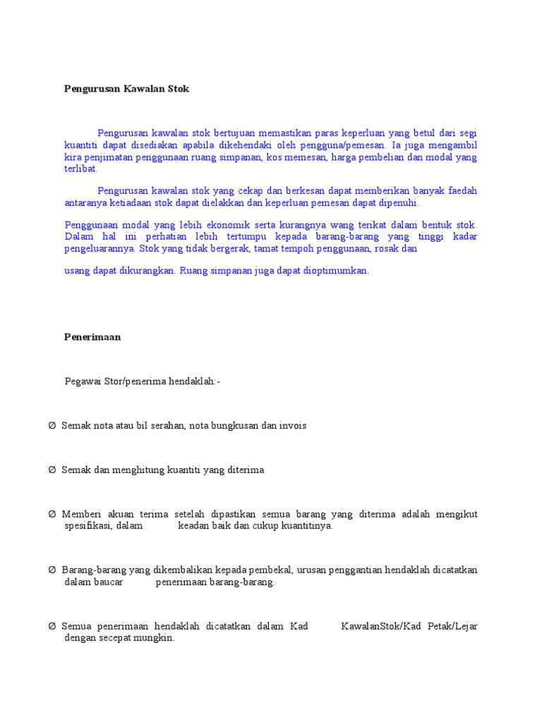 Bp pa kp m stor bhgn bekalan kawalan akaun rancang urus pembelian kawalan stok akaun pangkalan data bahagian terimaan terima periksa barang dibekal bahagian simpanan terima simpan keluar stok catat dalam kad petak keselamatan pengiraan stok bhgn pembungkusan penghantaran bungkus hantar kpd pelanggan pengurusan. Setiap pengeluaran hendaklah dicatatkan dalamkad petak dan kad stok dengan serta merta supaya baki sentiasa kemaskini setiap barang yang dikeluarkan perlu disertai dengan borang permintaan barang barang dan guru penyelia hendaklah memastikan borang penerimaan dikembalikanselepas barang barang diakui terima semua pesanan barang barang untuk. B p p a k p m semak butiran kew ps 10 kew ps 12 semak sama dengan pesanan terima kad petak tidak sempurna kew ps 2 perekodan kew ps 2 borang laporan terimaan barang barang kew ps 10 borang pesanan dan pengeluaran stok kew ps 12 senarai pembungkusan tidak sempurna kuantiti lebih kurang kualiti tidak elok atau.