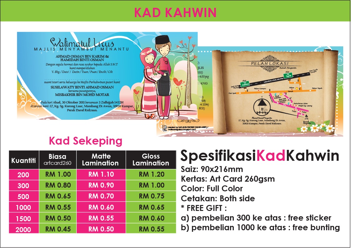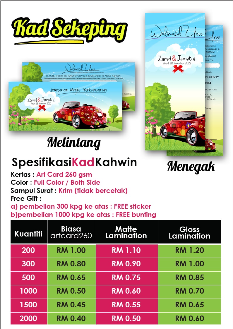 Harga basic full color harga hot samping gold silver 1 side. Premium kad kahwin pada harga serendah rm0 38 sen. Kami menawarkan pakej kad kahwin a dalam size kad 4x6inci jenis sekeping dengan tambahan. Harga serendah rm0 27 je sekeping.