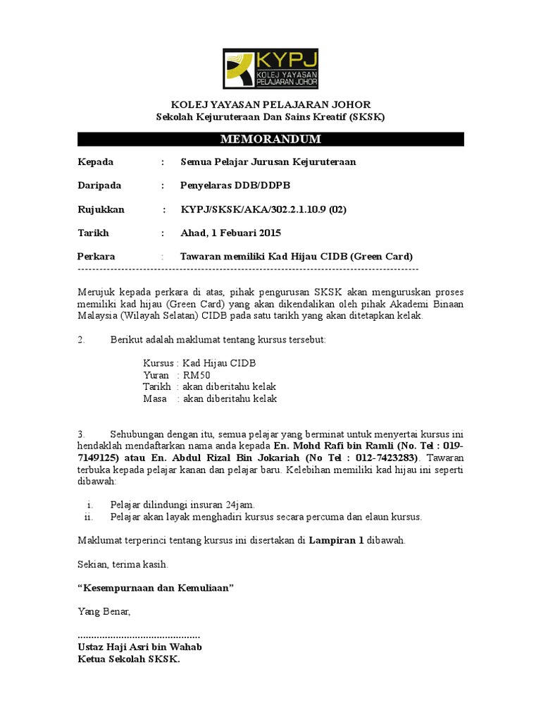Unknown march 07 2018 2 55 pm. Kami adalah syarikat bertauliah dilantik cidb untuk menjalankan kursus kad hijau. Ia adalah perakuan bagi pekerja binaan yang telah menjalani kursus latihan keselamatan di tapak pembinaan yang dikeluarkan oleh lembaga pembangunan industri pembinaan malaysia atau juga dikenali sebagai construction industry development board cidb malaysia. Lembaga pembangunan industri pembinaan atau lebih dikenali dengan nama singkatannya iaitu cidb merupakan sebuah badan yang ditubuhkan untuk mengawal selia pematuhan piawaian bagi mutu kerja binaan dan bahan binaan.