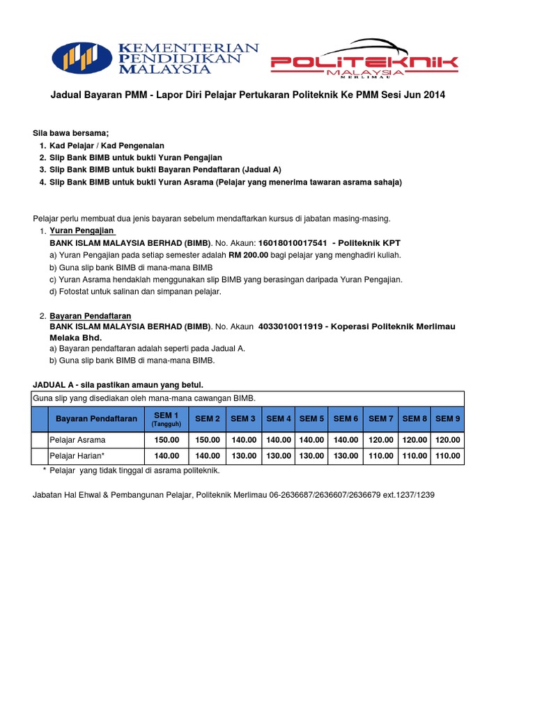 Bantuan pelajar pendidikan tinggi bppt akan dikreditkan terus ke dalam pemegang kad debit sediada. Sekiranya pelajar mengalami kemalangan atau kematian pelajar atau waris boleh berhubung terus dengan pegawai hal ehwal pelajar kebajikan dan disiplin secepat mungkin bagi tuntutan insuran. Jabatan pendidikan politeknik dan kolej komuniti tidak akan bertanggungjawab terhadap sebarang kerosakan atau kehilangan yang dialami disebabkan oleh. Kadar sumbangan setiap pelajar ialah rm18 setahun.