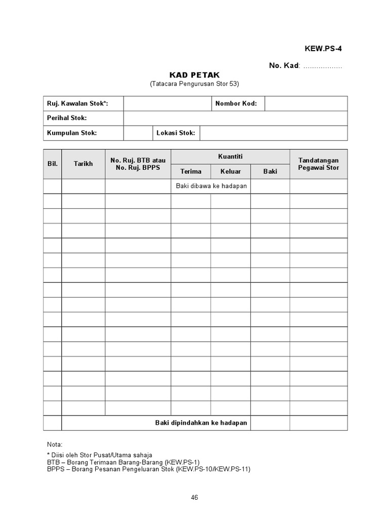 Ruj terima keluar baki pegawai stor bpps 1991 baki dibawa ke hadapan 1 1 1 pn shalena pn norashikin. Kew ps 3 kad kawalan stok kew ps 4 kad petak kew ps 4 kad petak warna kad kew ps 3 putih kew ps 4 hijau merah jambu untuk stok bertarikh luput kew ps 4 hijau merah jambu untuk stok bertarikh luput lokasi kad ditempatkan bersama stok kad petak barangan kimia mudah terbakar atau. Bilangan kad bermula dengan 1 nama stor.