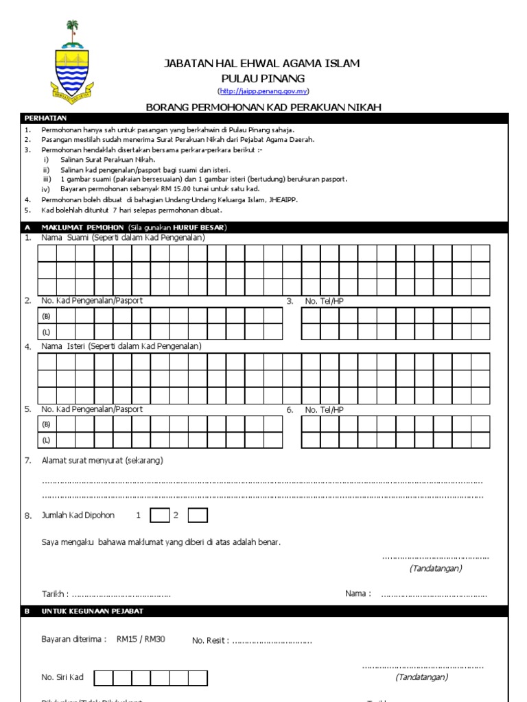 Kad pintar nikah pulau pinang. Setakat ini ia telah beroperasi dengan jayanya di seluruh negeri pulau pinang. Penjualan kad nikah yang berharga rm 15 sekeping. Ruju salinan perakuan ncr. Permohonan temuduga khas ini boleh dibuat secara online mulai 5 jun 2020.