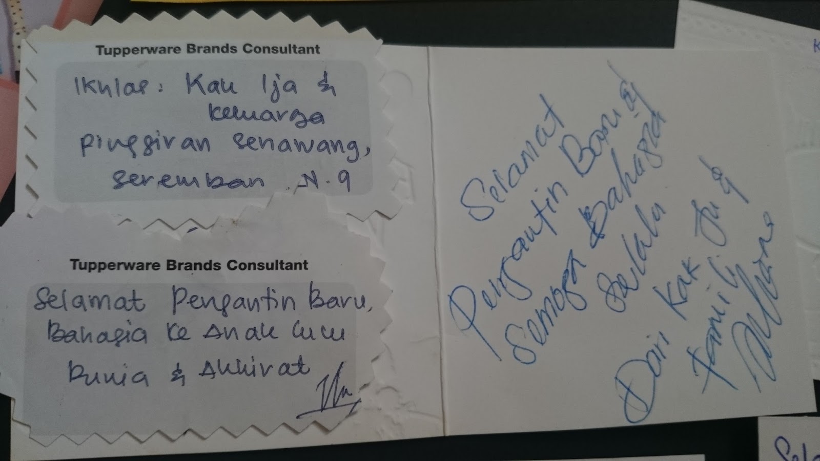Bulan lepas aku dok kemas kemas barang terjumpalah kad kad ucapan masa kawan kawan bagi hadiah masa majlis kahwin aku 2012 dulu. Tiada hadiah yang mahal pun suami tidak kisah asalkan pemberian ikhlas dari hati sang isteri sudah cukup membuatkan hati seorang suami bergetar.