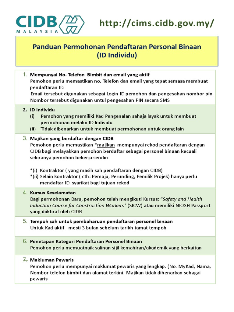 July 5 2017 july 5 2017 amirnawawi 38 comments cara mohon kad hijau online cara mohon kad hjau cidb terbaru cidb secara online kad hijau baru cidb mohon kad hijau online assalamualaikum dan salam sejahtera diucapkan kepada semua para pembaca blog yang dikasihi sekalian semoga anda semua berada dalam keadaan sihat sejahtera hendaknya. Keupayaan kewangan keupayaan teknikal operasi perniagaan dan pengurusan perniagaan. Cidb kini telah mengambil langkah proaktif dengan menambah saluran bayaran untuk kemudahan pengguna. Example for mykad 910101101234 without the dash or space.