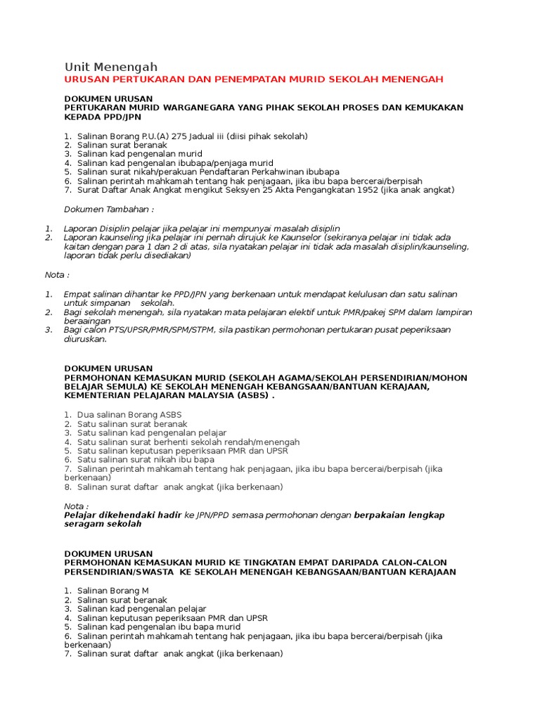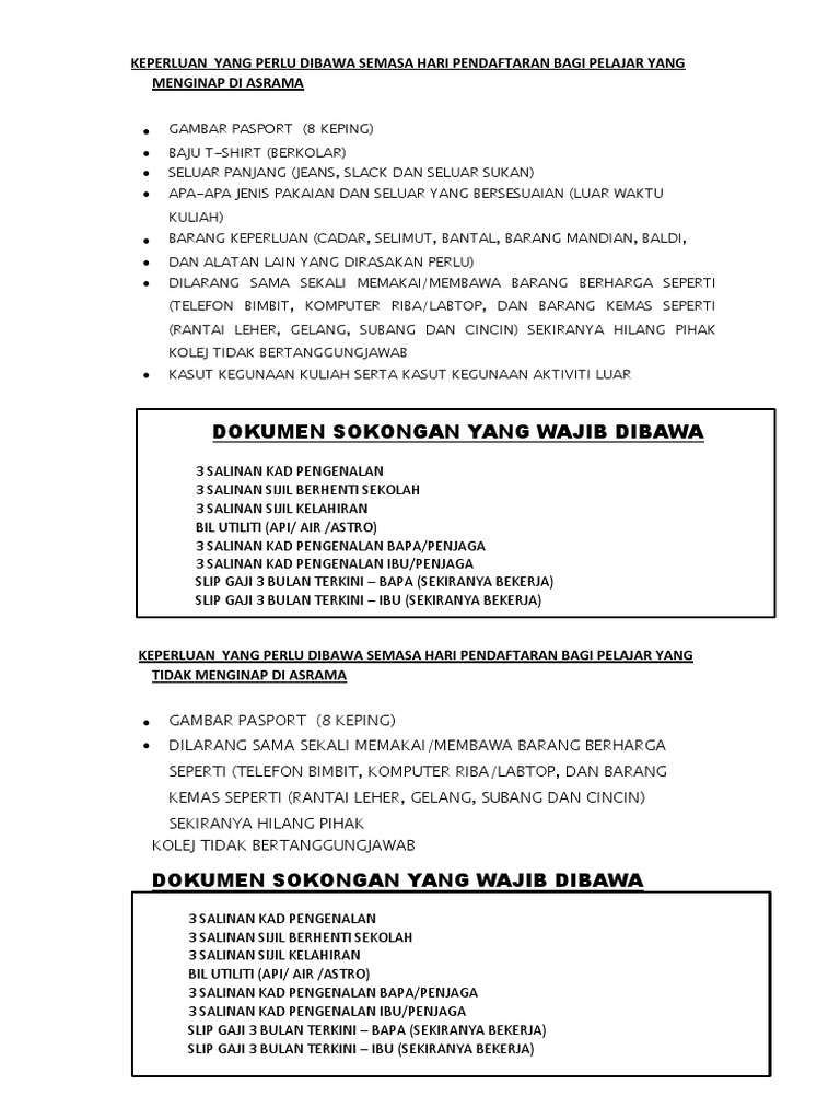 Syarat am untuk mengikuti program pengajian. Salinan slip bank resit pembayaran pendaftaran awal pengajian yang telah dijelaskan atau apa apa dokumen bukti pembayaran masuk atau surat akuan masuk belajar daripada ipt. Sijil kelahiran pelajar salinan hendaklah disahkan 8. 2 salinan kad pengenalan ibubapa penjaga 2 salinan sijil nikah ibubapa penjaga 2 salinan sijil keputusan pt3 jika pelajar akan memasuki tingkatan 4 ketika masuk sekolah baru.