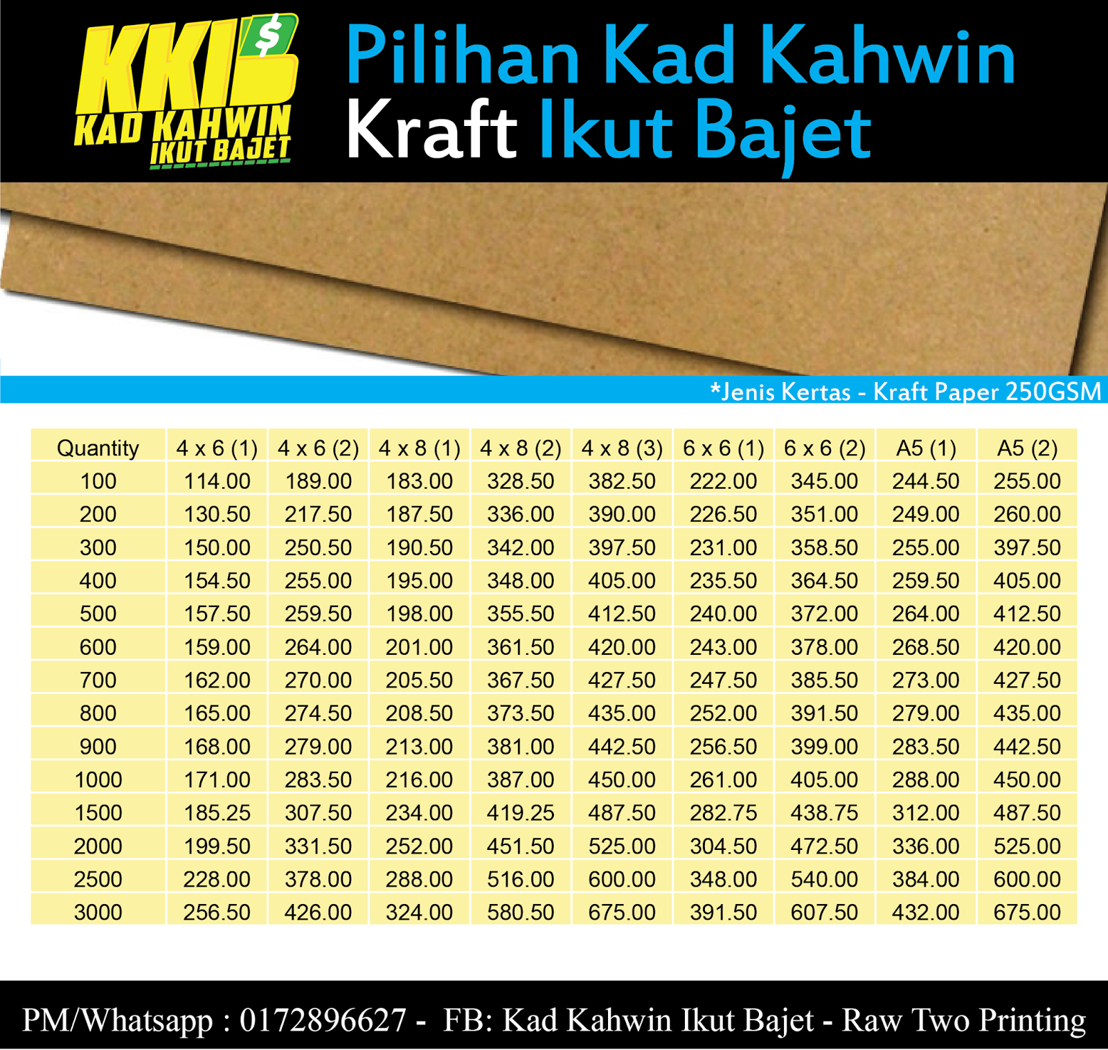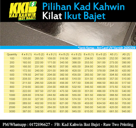 Senarai harga kad kahwin. Senarai harga kad kahwin. Silkymatt 310gsm cetakan. Premium kad kahwin pada harga serendah rm0 38 sen. Pada masa kini kami menawarkan 2 kategori harga iaitu harga kad cetakan full color pada material art card dan juga kad cetakan hot stamping pada material art card.