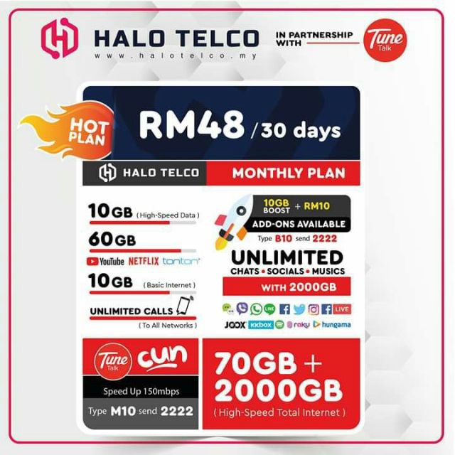 2gb high speed data 2000gb unlimited chats socials music unlimited calls to tune talk harga sim kad tune talk halo telco ini hanya rm10 shja. Top up rm50 ke atas akan dapat rm2000 khairat.