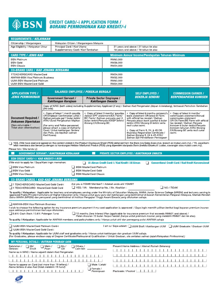 Enjoy special discounts and offers from dining and shopping to travel treats at selected merchants. Bsn credit card i members can now access your credit card i statements via e statement for free. You can apply up to a maximum of 5 supplementary cards extended to your spouse children and immediate family who are 18 years and above. Kad kredit i bsn please write in capital letters and as appropriate.