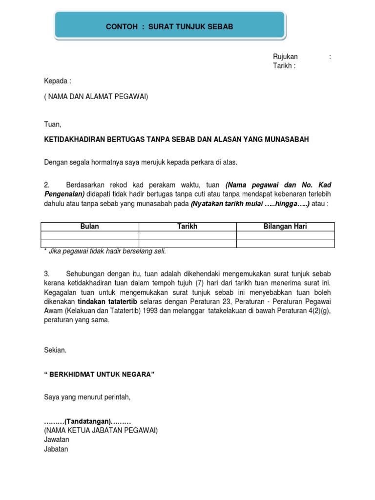 Surat tunjuk sebab perlu diberi kepada pegawai yang telah melanggar sistem tersebut dan amaran diberi supaya tidak mengulangi kesalahan yang sama. Contoh surat tunjuk sebab apabila anda bekerja dibawah sebuah organisasi atau makan gaji dan ada ketikanya anda tidak dapat hadir ke tempat kerja tanpa sijil medial leave anda diminta oleh majikan untuk menyediakan surat tunjuk sebab tidak hadir ke tempat kerja seperti yang sepatutnya. Kad perakam waktu surat pekeliling am bil. Sehubungan dengan itu tuan adalah dikehendaki mengemukakan surat tunjuk sebab kerana ketidakhadiran tuan dalam tempoh tujuh 7 hari dari tarikh tuan menerima surat ini.
