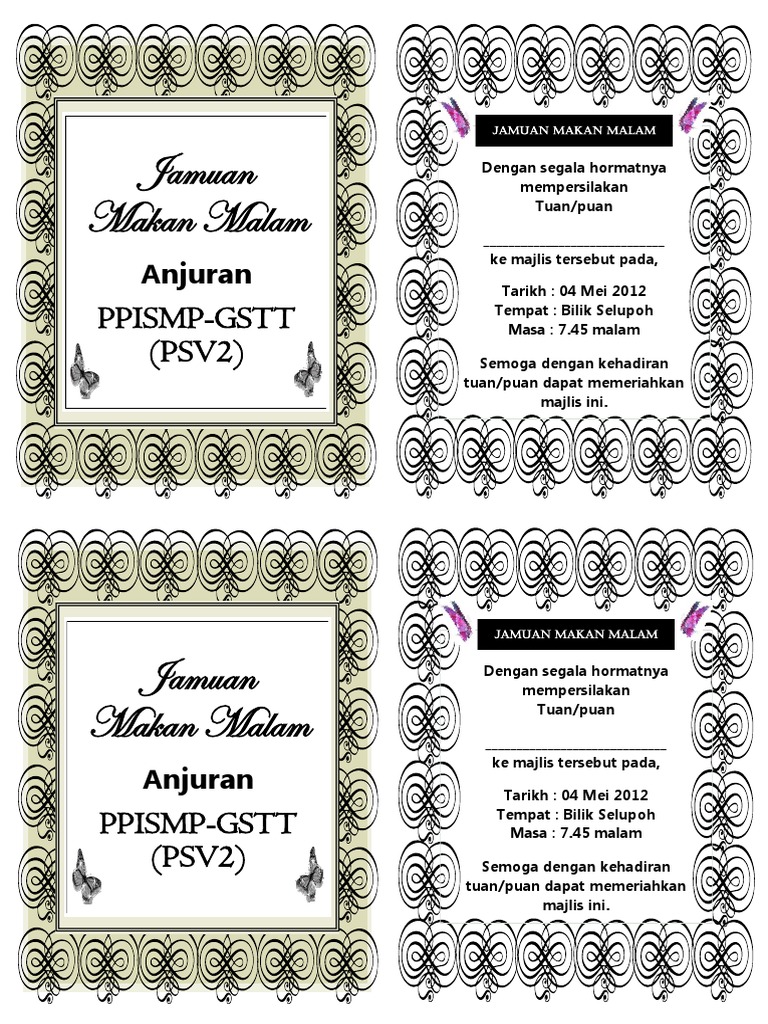 Harap blog kali ini dapat membantu anda membuat atau mereka sendiri kad ucapan kad jemputan atau kad undangan untuk majlis anda. Template yang telah dipilih dan anda cuma perlu masukkan maklumat yang diperlukan. Template kad jemputan jamuan akhir tahun. Kad jemputan majlis makan malam dear frens parents teachers association pibg of sjk t bandar indera mahkota kuantan formerly known as srjk t jalan penjara has embarked on a charity fund raising event to help to create for better academic and support the continuous development of the school.